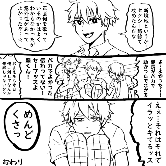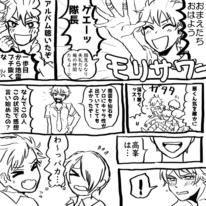 あんスタ ・2019年の夏、流星隊アルバムの高峯ソロ(真昼の残像)を聴いて頭トチ狂って描いたネタ ・発売当日までお互いのソロを聴いてなかったっていう設定、すべてが捏造 ・先輩後輩のつもりで描いたけど高峯→守沢っぽいかもしれません あれがもし転校生プロデュース設定ならマジでワイP何やってんの正気か?と思った… 南雲と仙石はソロ聴いた瞬間すべて察して走り出したと思う そんなネタ描いといてなんだけど、守沢は毎晩本を読んでる文学少年なので 全部わかってんのもそれはそれでアリ